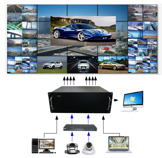 外置拼接解碼處理器(H.265)是專門為同時接入處理網(wǎng)絡(luò)攝像機(jī)(IPC)和外部源輸入信號(HDMI,DVI,VGA等)而設(shè)計,采用最新的專用圖像解碼芯片與FPGA搭配,通過專用圖像解碼芯片解碼網(wǎng)絡(luò)攝像機(jī)的信號,然后再和通過FPGA接入的外部源輸入信號混合處理,實(shí)現(xiàn)圖像切換,拼接,開窗,漫游等功能,是目前解決網(wǎng)絡(luò)攝像機(jī)